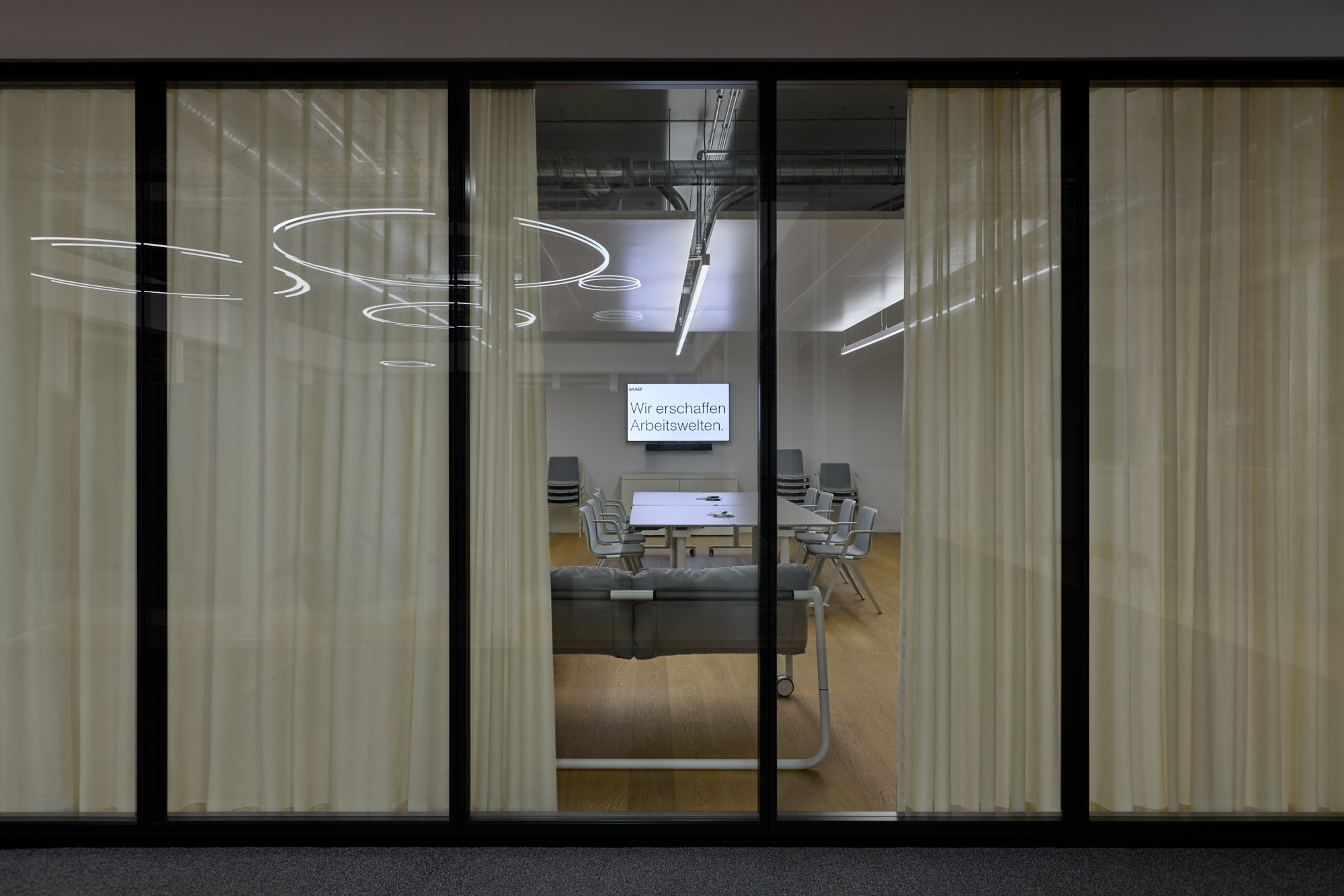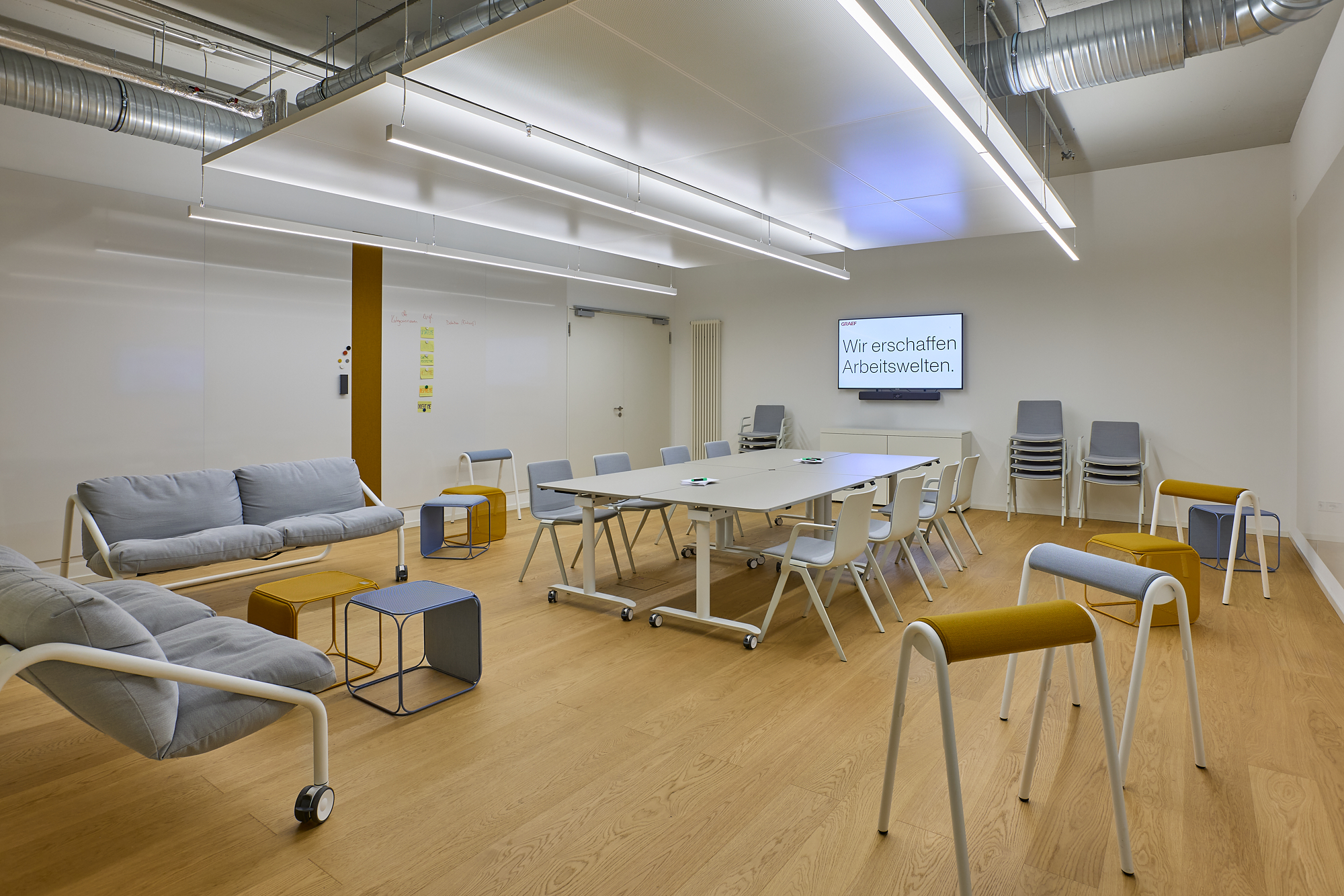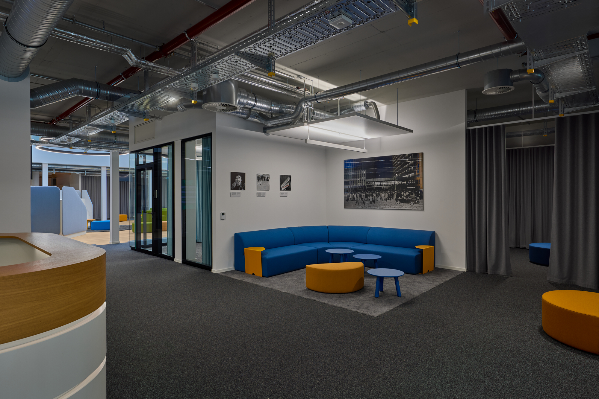 Auch das Licht spielte eine wesentliche Rolle in der Gestaltung. Die runden Leuchten sind eine bewusste Antwort auf die Rundungen der Möbel und verstärken das harmonische Gesamtbild. Die funktionale Anordnung in unserem neuen Bürodesign ist sorgfältig durchdacht. Lockerbereiche und Arbeitsplätze sind dezentral platziert, um eine flexible und dynamische Arbeitsumgebung zu fördern. Diese Struktur unterstützt die Zusammenarbeit und ermöglicht eine optimale Raumnutzung. Farben wurden dezent als Akzente eingesetzt, um die Fläche lebendig und inspirierend zu gestalten, ohne dabei überwältigend zu wirken.