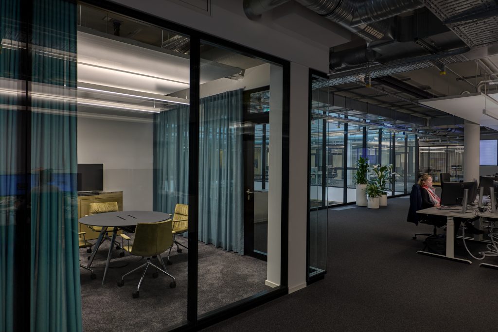 Bei der Aufteilung der zwei Etagen haben wir den kommunikativen Mittelpunkt ins offen gestaltete Erdgeschoss gelegt. Hier findet sich nun Raum für Begegnung, Austausch und Veranstaltungen. Es gibt Audio- und Videostudios, Workshopflächen, Rückzugräume und eine Bar. Zentrales Element ist das flexibel angelegte Atrium. Mit seiner hohen Decke versorgt es die gesamte Fläche mit Tageslicht.