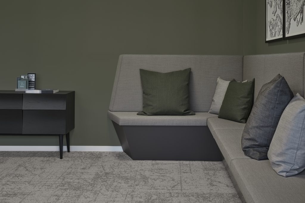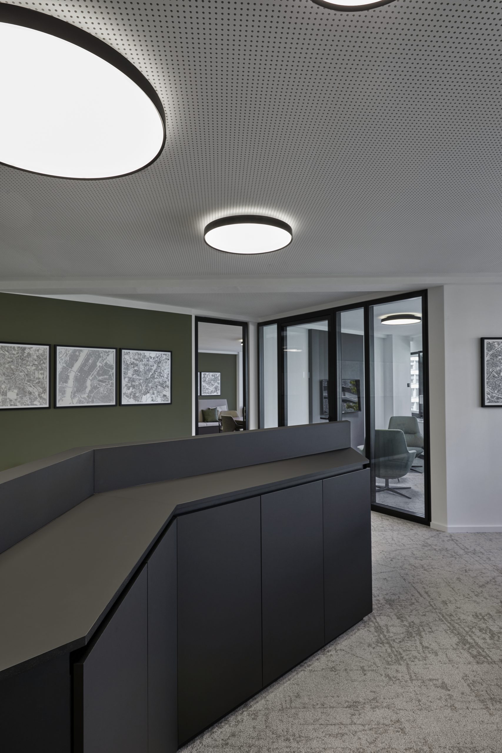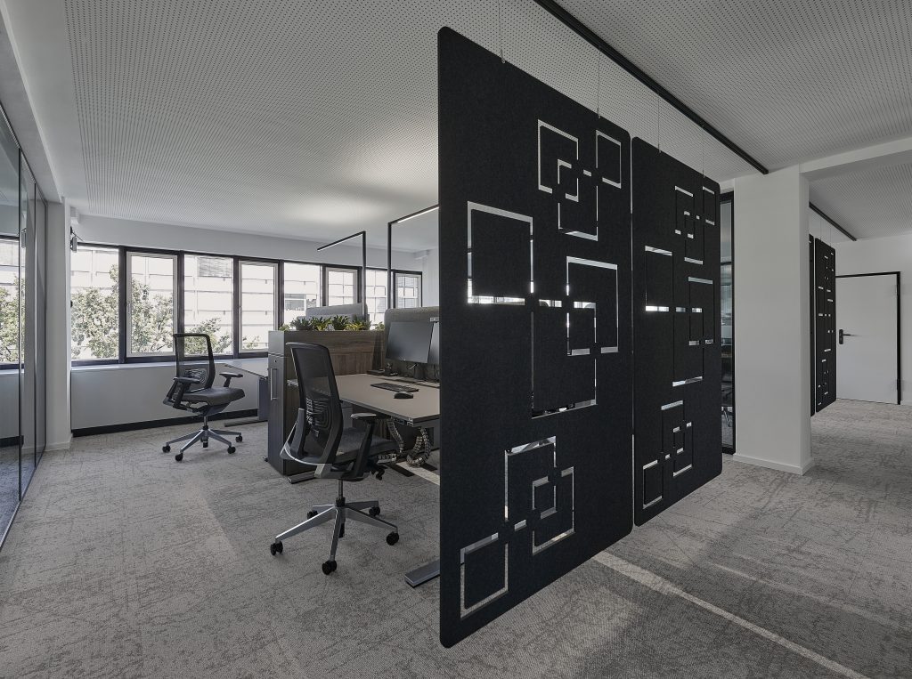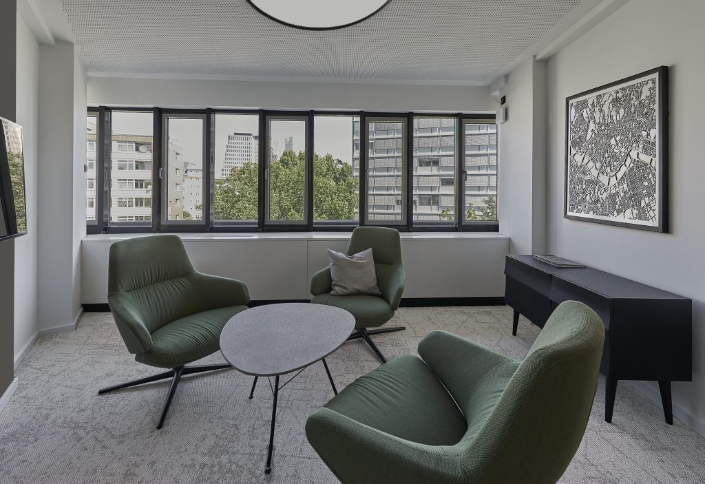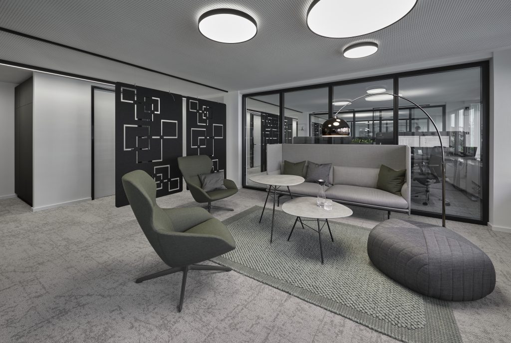 Offene Bereiche, geschützt durch individualisierte Akustikvorhänge sowie geschlossene Räume, zoniert durch Glastrennwände bieten ausreichend Raum für unterschiedlichste Arbeitsanforderungen und Meetingformate des Unternehmens. Vorhandenes Mobiliar wurde, durch Kombination mit neuen Elementen und innovativen Oberflächen, gelungen in das elegante Konzept integriert.
