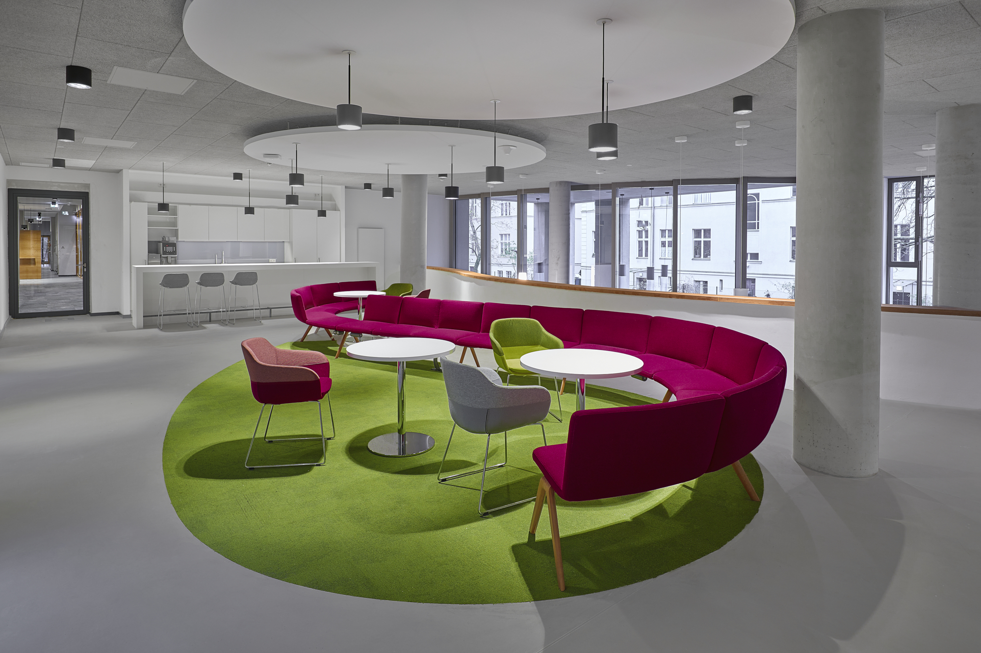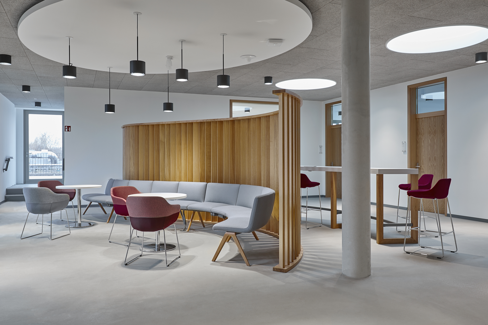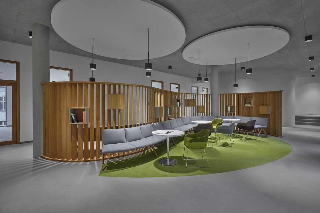 Wir haben hierfür Räume geschaffen in denen man sich in informellen Knotenpunkten begegnen kann aber auch formell zusammenarbeitet. Mit warmen Farbtönen und einer organischen Formensprache haben wir einen klaren Kontrast zur puristischen Architektur geschaffen. Einheitliche, innenarchitektonische Sprache für Identifikation mit Unternehmen und Klarheit über die Funktion der Arbeitsorte war für uns dabei immer Leitbild.