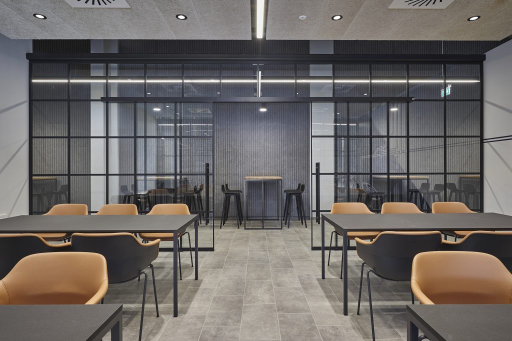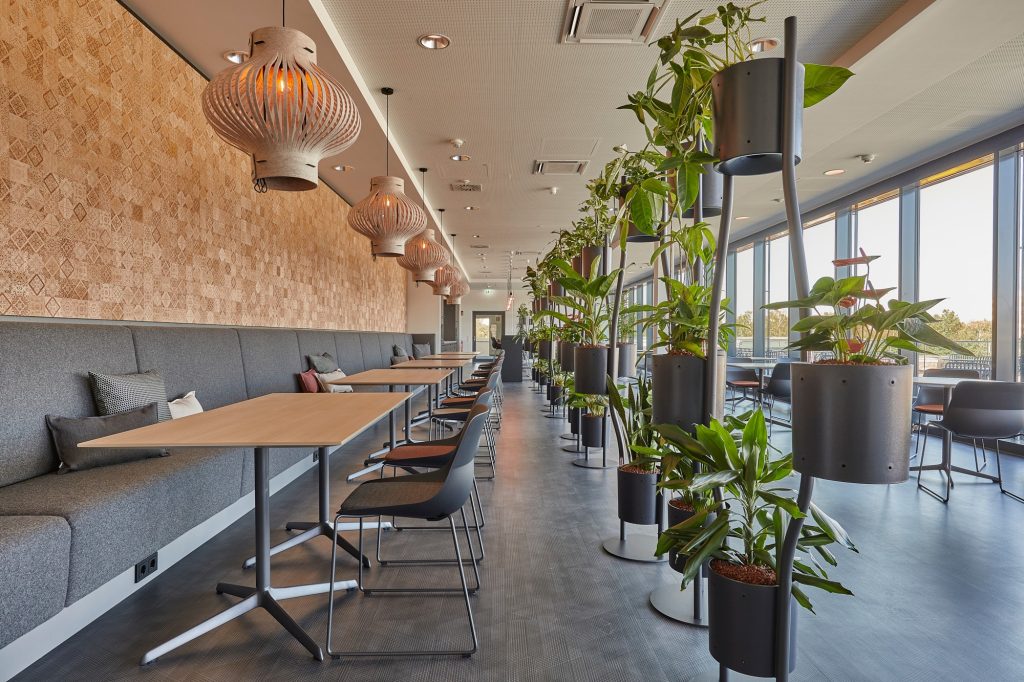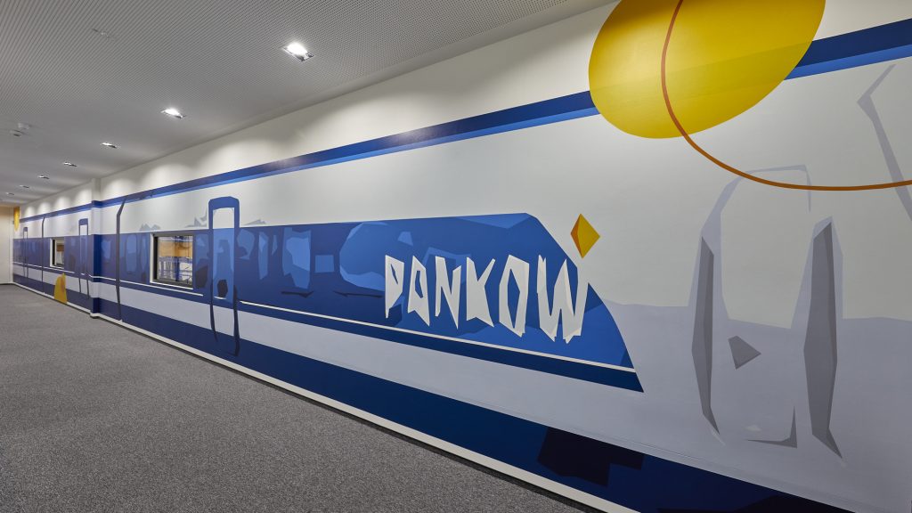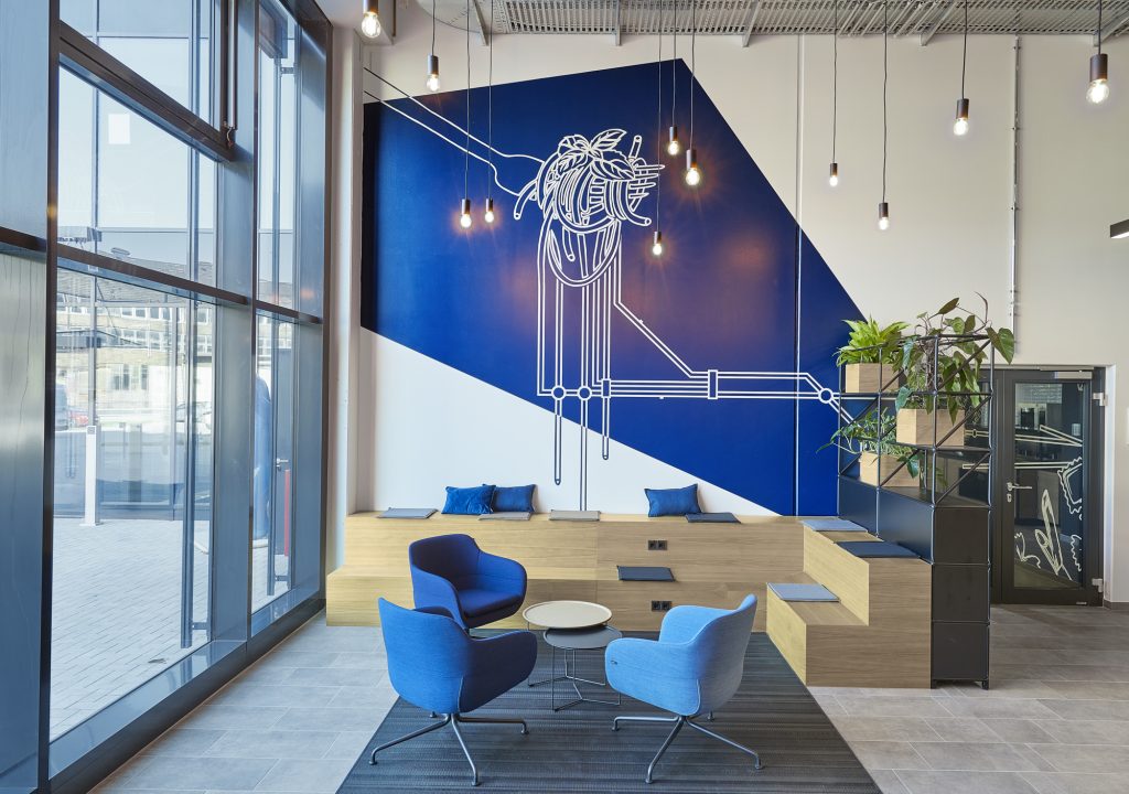 Uns war es wichtig, das Thema „Zug und Schiene“ frei in der Boden- und Wandgestaltung aufzunehmen. Die Gestaltung des Workcafés und der Kantine setzt bewusst Kontraste zur Büroausstattung durch das Einbringen von wohnlichen, erdigen Farbtönen und Holz.