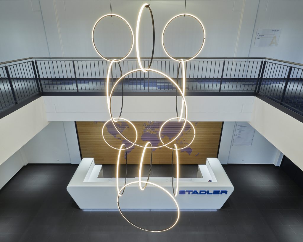 Gemeinsam mit dem Projektteam von Stadler arbeiteten wir an unterschiedlichsten Worksettings für die Flächen. Zum einen entstanden Raumangebote für bereichsübergreifende, kollaborative Arbeit, zum anderen Rückzugsmöglichkeiten für konzentrierte Arbeit, vertrauliche Gespräche und Telefonie.