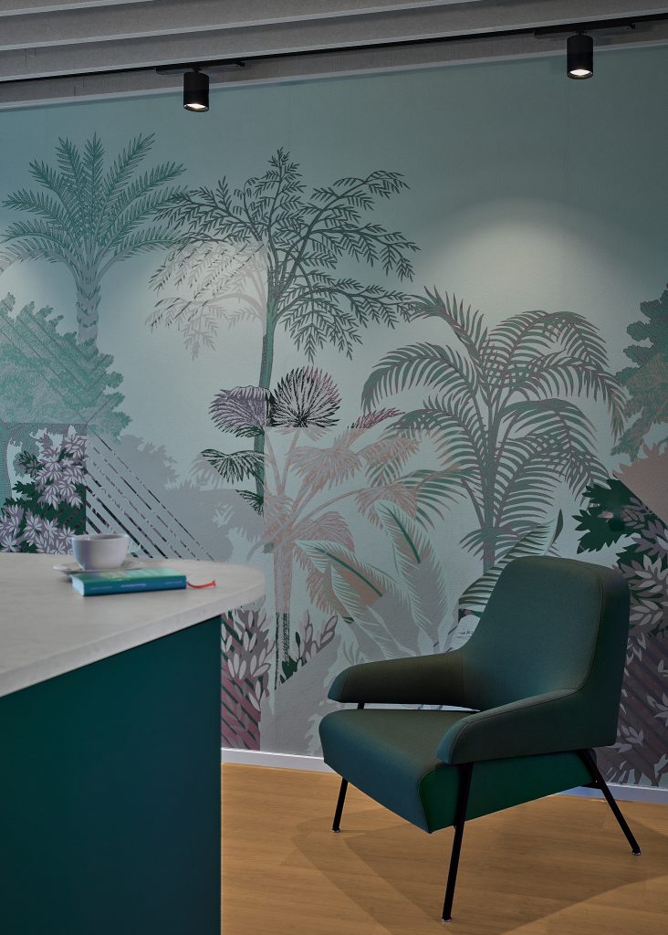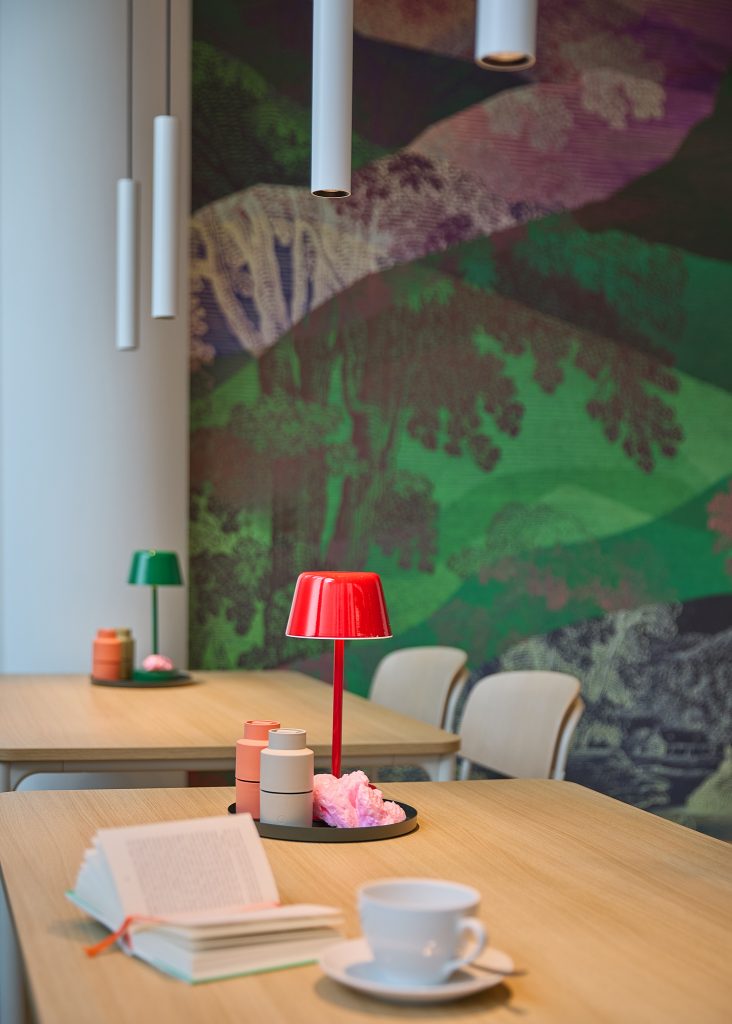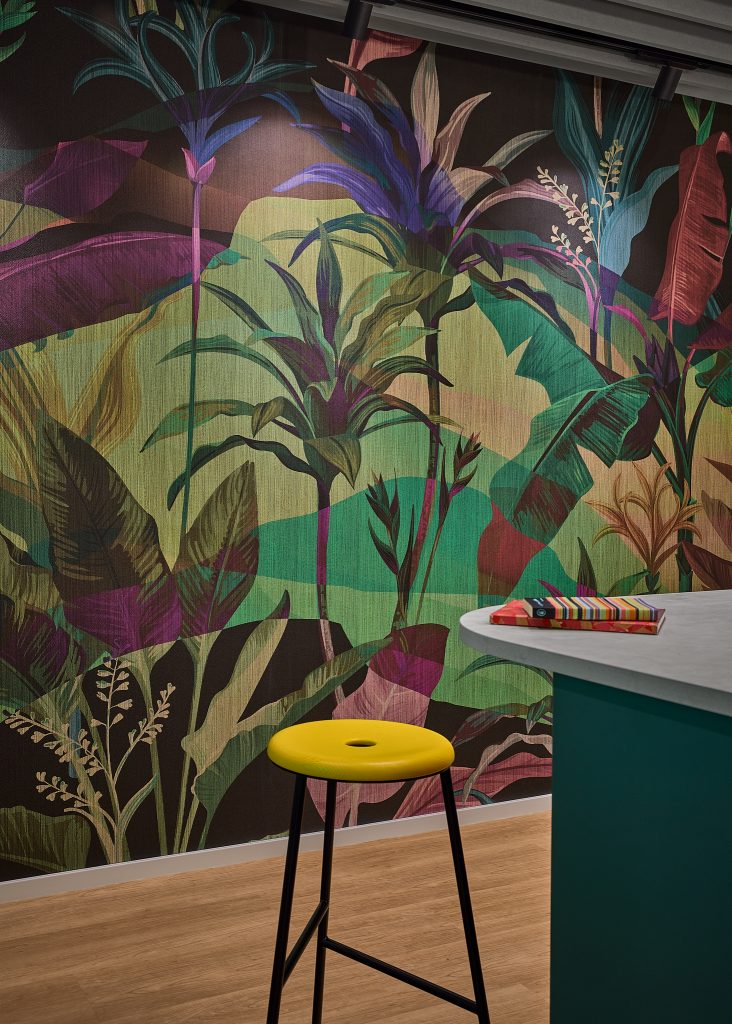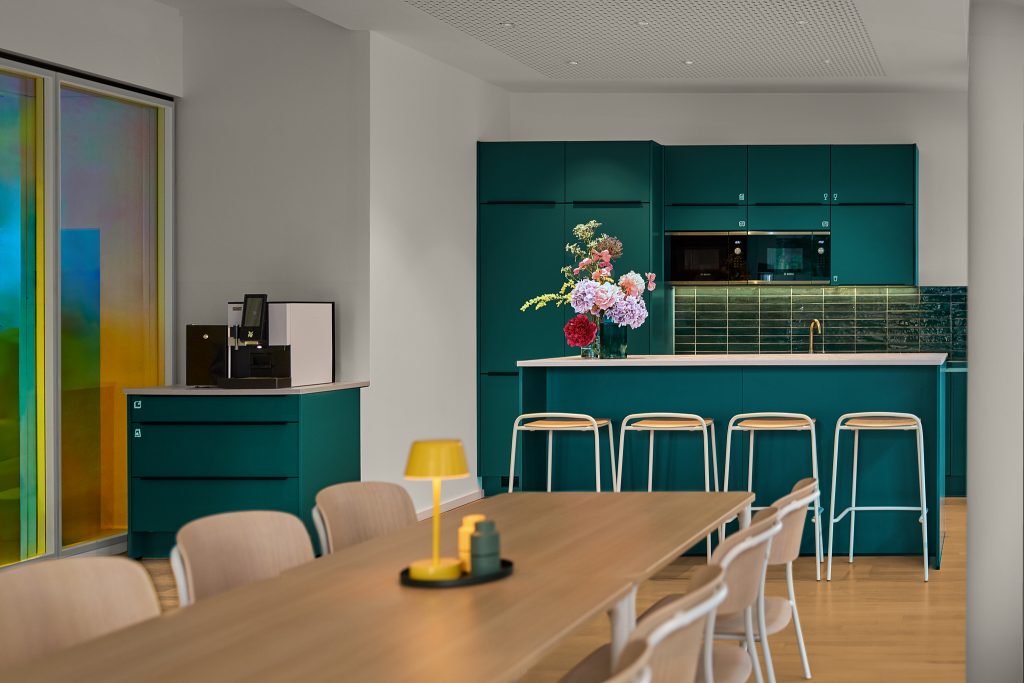 Die farbenfrohe Cafeteria ist das neue Herzstück der Fläche und bietet Platz für informelle Treffen und Gespräche in der Mittagspause.