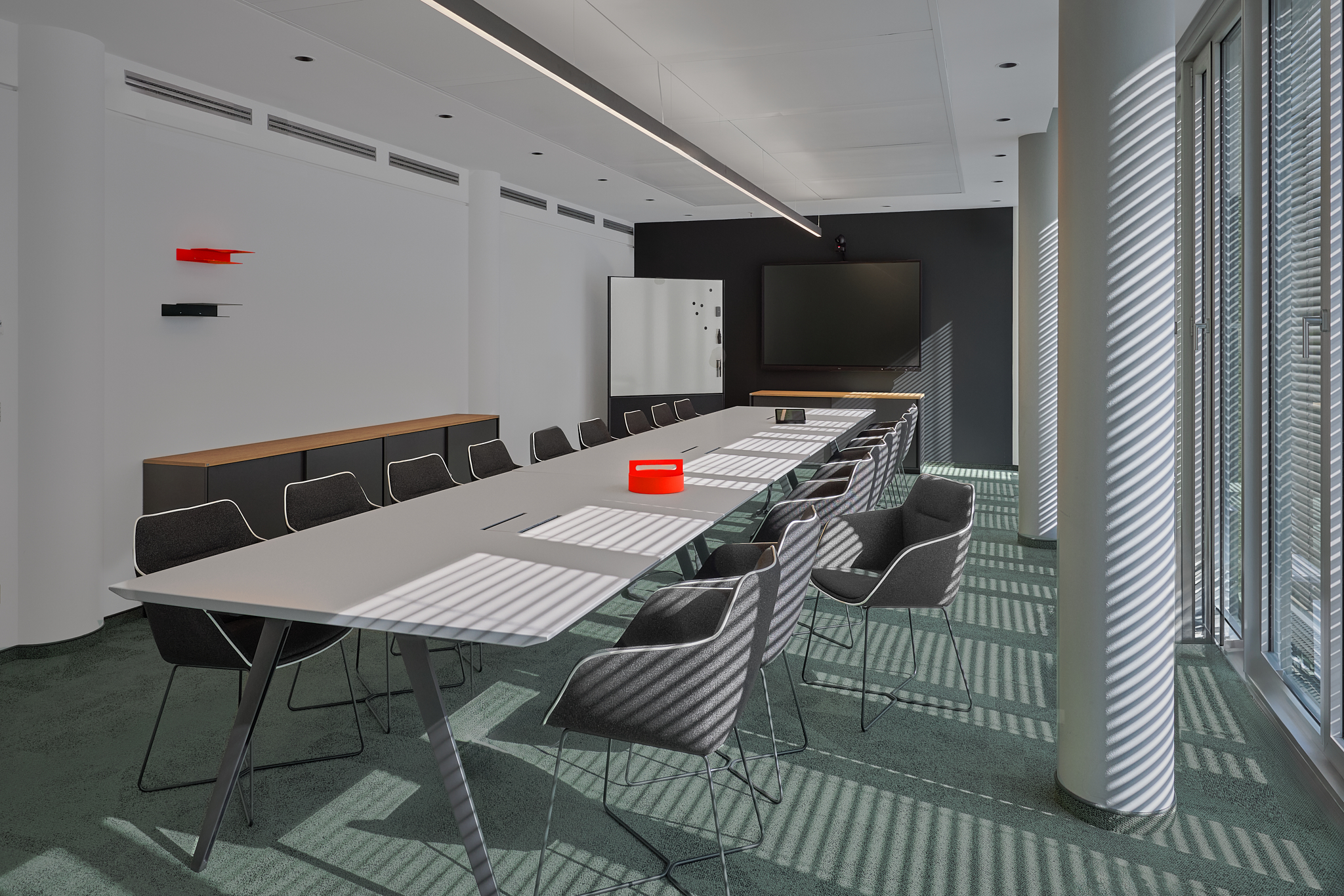 Die großzügige Konferenzetage mit großem Saal, zentraler Lobby und verschiedenen Besprechungsräumen zeigt die gelungene Kombination aus klassische Formensprache mit modernen Akzenten in Möblierung, Oberflächen und Tischlereinbauten.