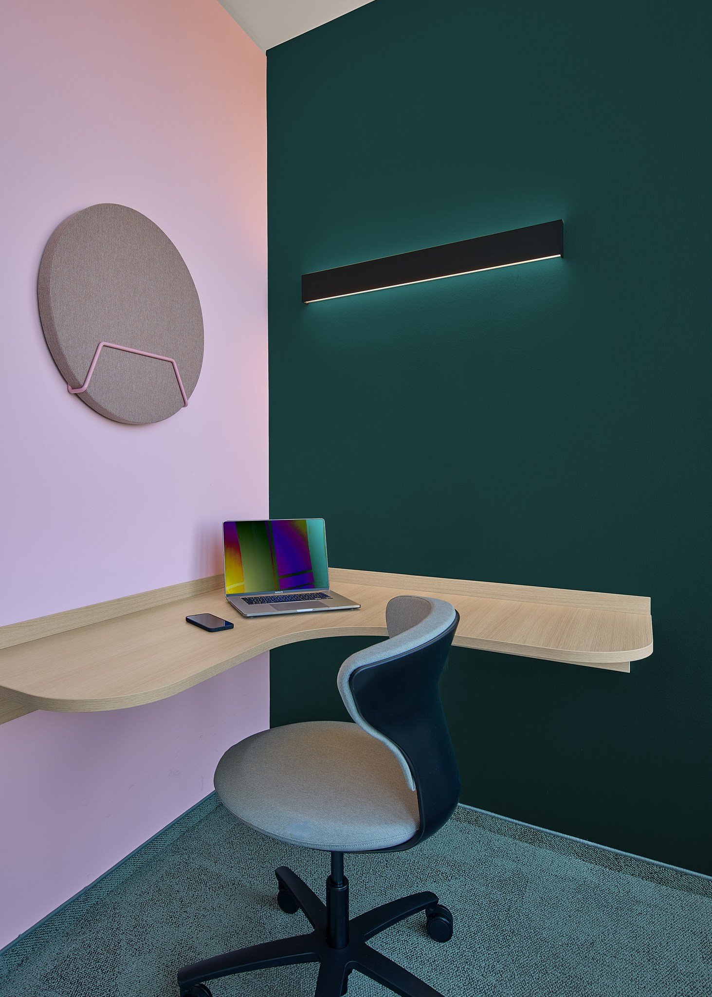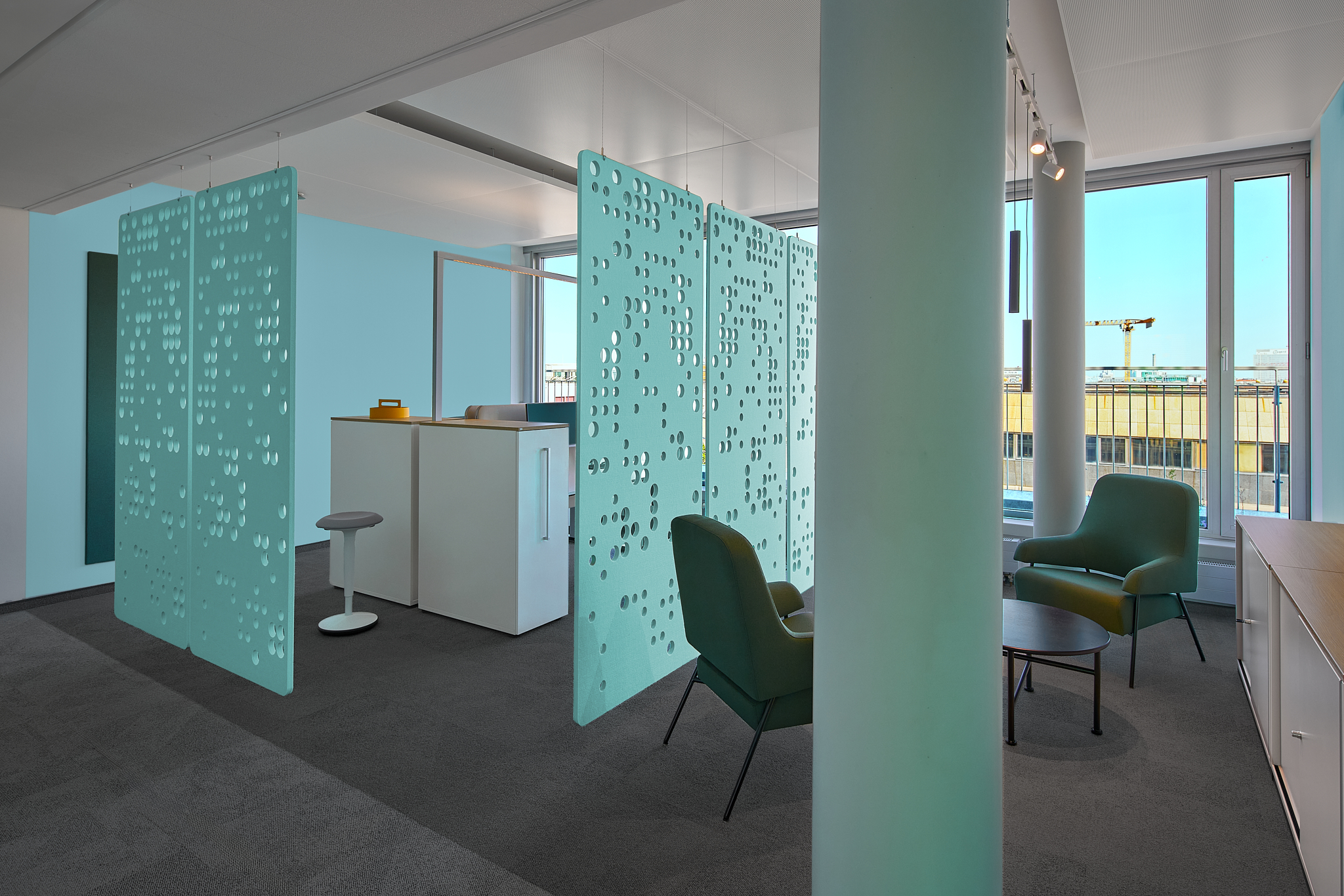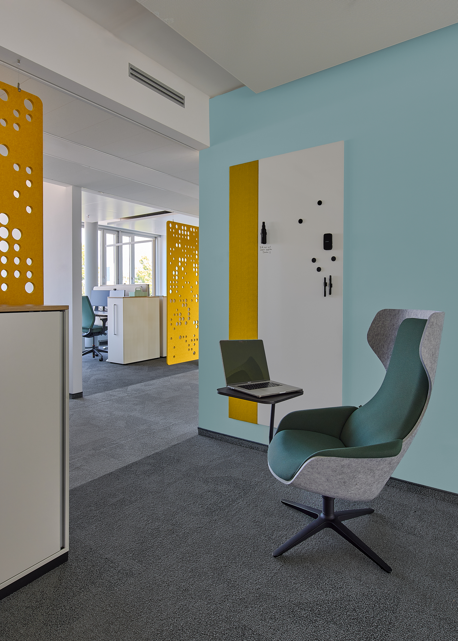 In den offenen Büroflächen ist die Möblierung schlicht und zurückhaltend gestaltet. Durch Farbakzente werden einzelne Bereiche voneinander unterschieden.