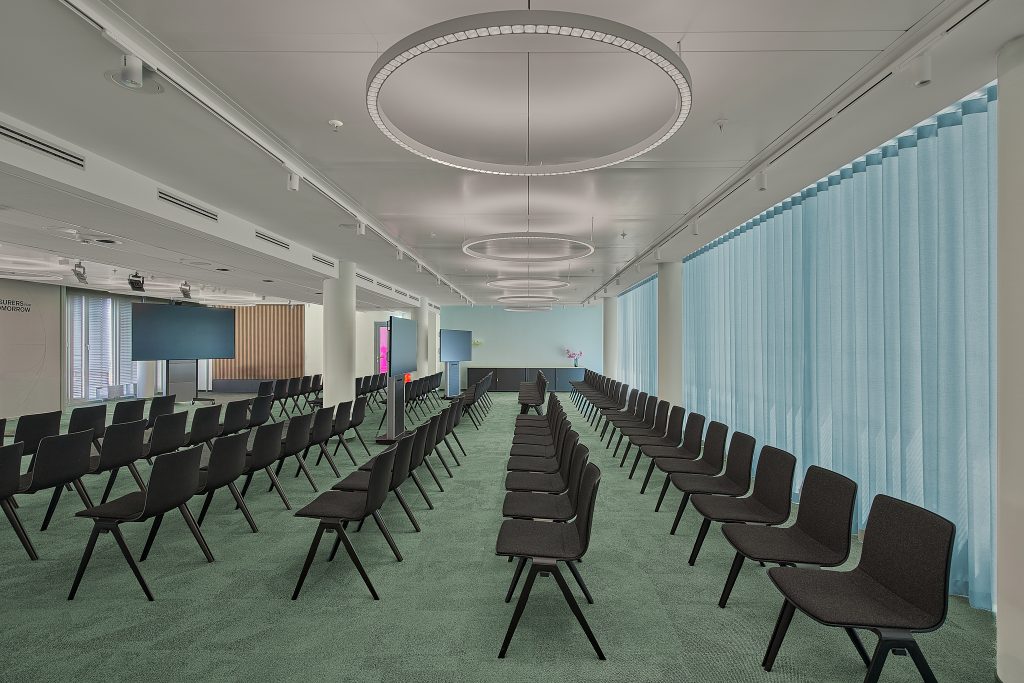 Im weiteren Entwurfsprozess wurde das Gestaltungskonzept mit einer Projektgruppe innerhalb eines Material- und Farbworkshops erarbeitet. Die gestalterische Umsetzung und alle Anforderungen in Bezug auf den Innenausbau (inkl. Beleuchtung, Elektro, Integration Medientechnik) wurde durch uns federführend koordiniert und begleitet. Dank eines hohen Tempos und intensiver Zusammenarbeit konnte das Projekt termingerecht und im vorgesehenen Budgetrahmen realisiert werden.