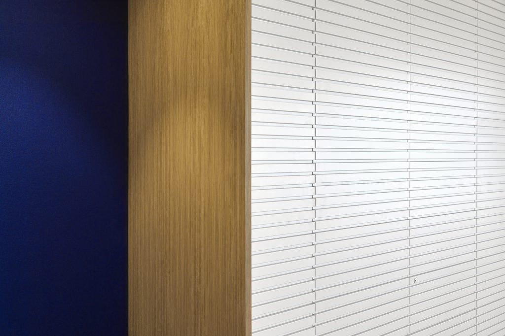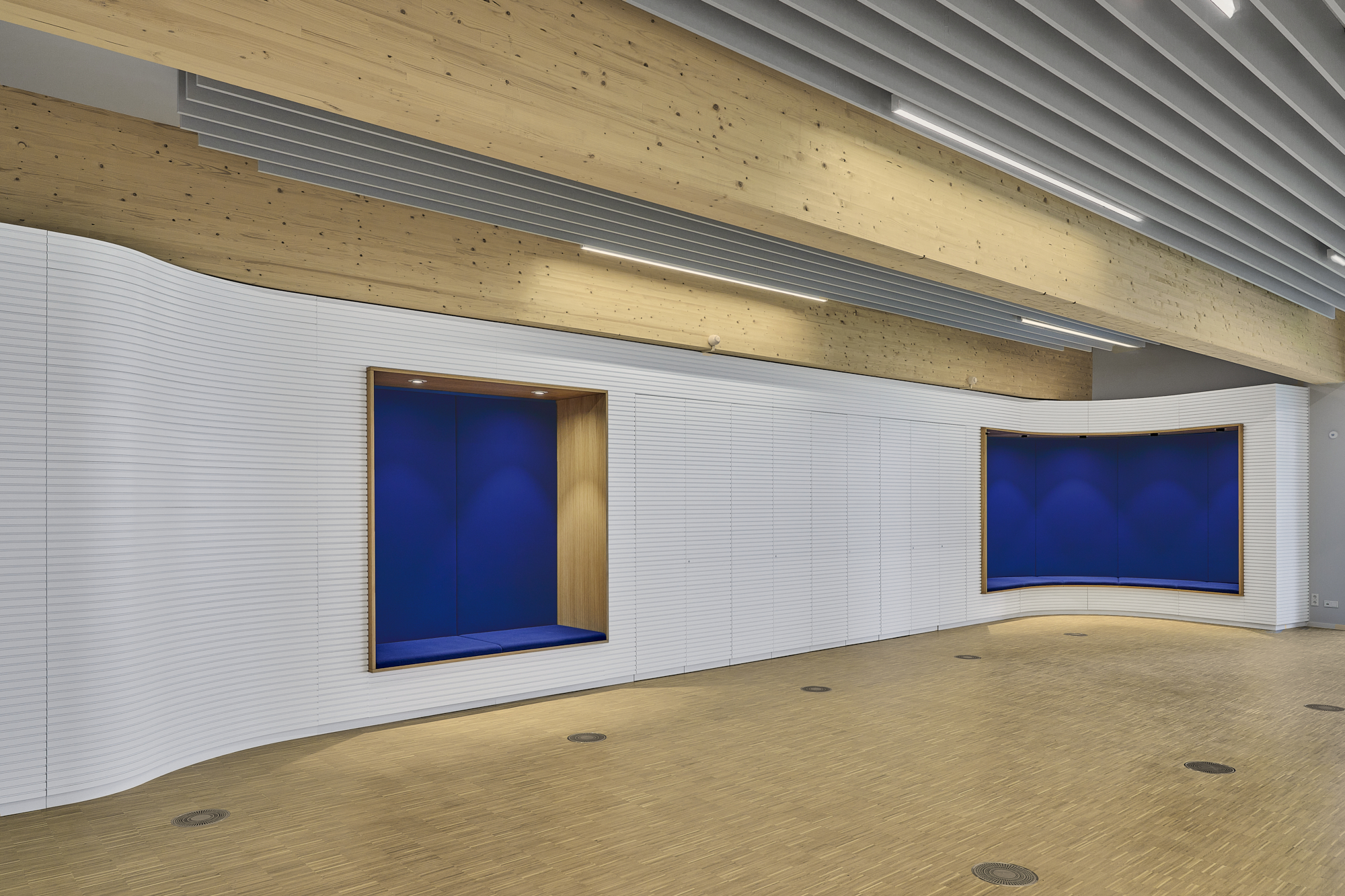 Durch die Kombination mit echtem Eichenholz schufen wir eine warme Atmosphäre. Ein besonderes Highlight des Ausstattungskonzeptes sind die 3D-Paneel-Schrankoberflächen. Diese stellen nicht nur ein besonderes Designmerkmal dar, sondern bieten gleichzeitig thermische und akustische Vorteile.