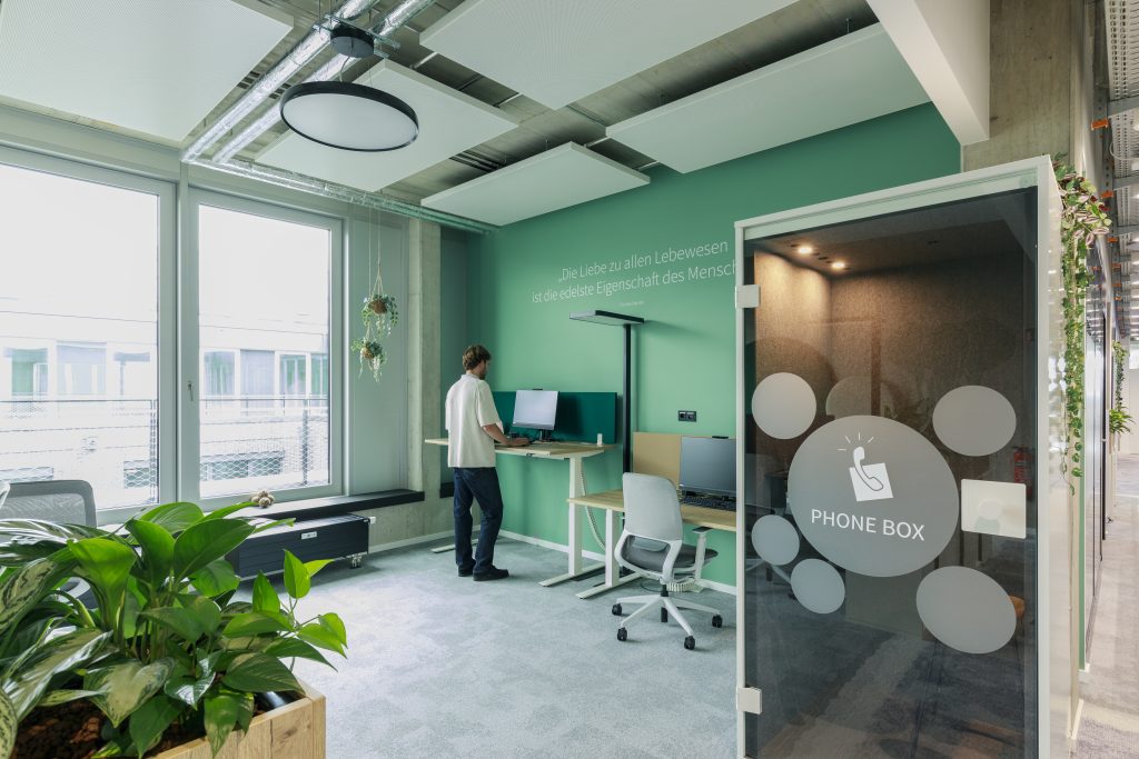 The open space areas were designed to ensure good work quality and acoustics, even in an open environment, by combining phone booths and sound-absorbing panels.