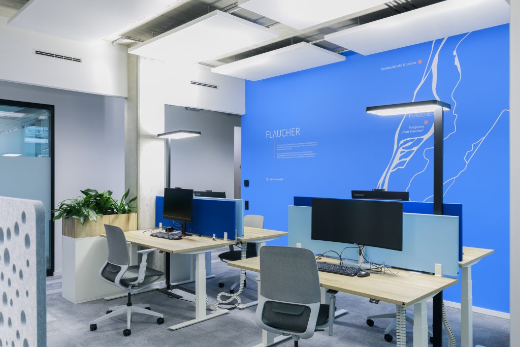 Large wall graphics in the open space areas bring a sense of connection to the location and variety. For example, here is the “Flaucher,” a section of the Isar River and a recreational area in Munich’s Obersendling district.