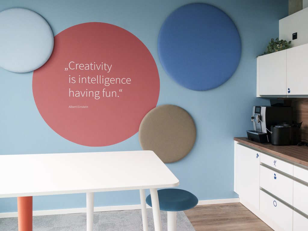 The guideline for our interior design was based on the corporate design colors of 1000 Satellites. The style of the graphics and the loose furniture concept were inspired by the first satellite offices in Mannheim.