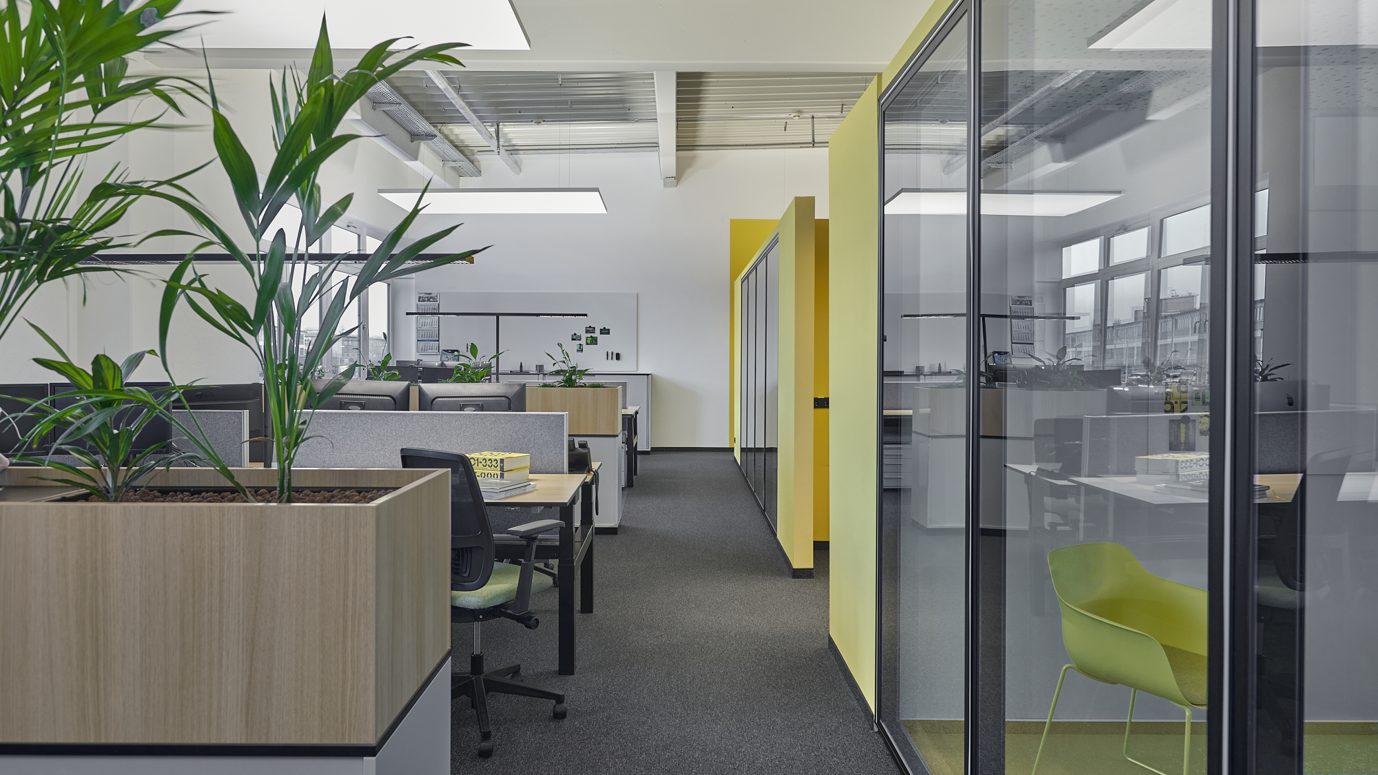 Especially the development of a comprehensive interior design concept was a lot of fun for us. A highlight is the striking yellow stripe, which is based on the company’s CD and runs three-dimensionally through the center of the space and serves as an acoustic filter. In the entrance lounge and conference kitchen, with their wooden surfaces and versatile green tones, the user is immersed in a naturally designed room atmosphere with a feel-good factor.