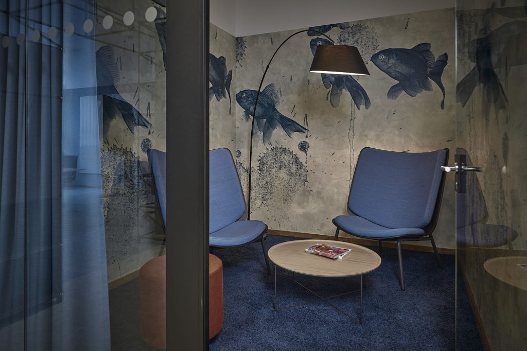 Je tiefer man sich in das Gebäude hineinbewegt, desto mehr verändert sich die Atmosphäre. Akustisch wird es ruhiger, visuell geschützter. Die Materialien reagieren mit – so werden Teppichböden dicker, Trennwände höher, Oberflächen absorbierender. Räume für konzentriertes Arbeiten und vertrauliche Gespräche sind klar abgegrenzt, jedoch weiterhin als Teil eines durchdachten Gesamtsystems erfahrbar. Die Arbeitsbereiche sind abgestuft zoniert – vom agilen Projektbereich über offene Teambüros bis hin zu Rückzugsorten und Workshopzonen.